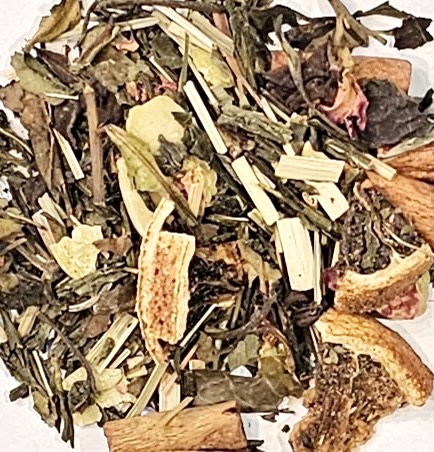 This exquisite infusion combines the warmth of home-baked sweetness with the elegance of fine tea. The first enticing aromas offer creamy and sweet notes, followed by a spicy cinnamon and nutty almond scent. The lively citrus flavors of orange and lemongrass enhance the cup with zesty freshness, while delicate rose petals and the silken lightness of white tea bring a soft, lingering finish. The flavor profile reveals a symphony of warmth and sweetness, elevated by lively citrus and softened by delicate floral notes — a perfect balance of comfort and refinement. This is a blend of green and white tea, cinnamon, lemongrass, orange peel, almond pieces, natural almond and orange flavoring, and rose petals.